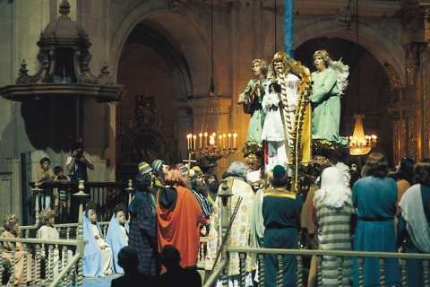 his extraordinary religious drama, the only living example of primitive lyric theatre, is also the only one in the world to be staged inside a church – the Santa María Basilica – thanks to a special dispensation granted by Pope Urban VIII. It is divided into two acts. The first is the dormition of the Virgin Mary, in the presence of the apostles and angels. The second is Our Lady’s Assumption into heaven. The Mystery of Elche is a beautiful show, with exquisite Medieval music. The play consists of the angel descending on the 'Mangrama', with a beautifully decorated white palm in his hands, which he presents to the Virgin Mary. She then presents it to the Apostle John. The palm is kissed by Mary before being handed over to the apostle, thus anointing it with the finest of blessings. This grace transcends to the town when the branches of the palm are handed out following the play. Then, the 'Misteri' is taken to the streets in a procession of the 'burial' of Mary with songs from the 'Festa' and the participation of actors.