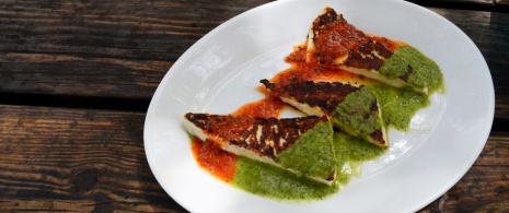 This simple but delicious starter that originated in La Palma. It is very easy to prepare: cut some very thin slices of soft or semi-cured Canary Island cheese (almost always smoked) and roast them in the oven with a drizzle of olive oil. Then serve with some red or green mojo sauce on top.