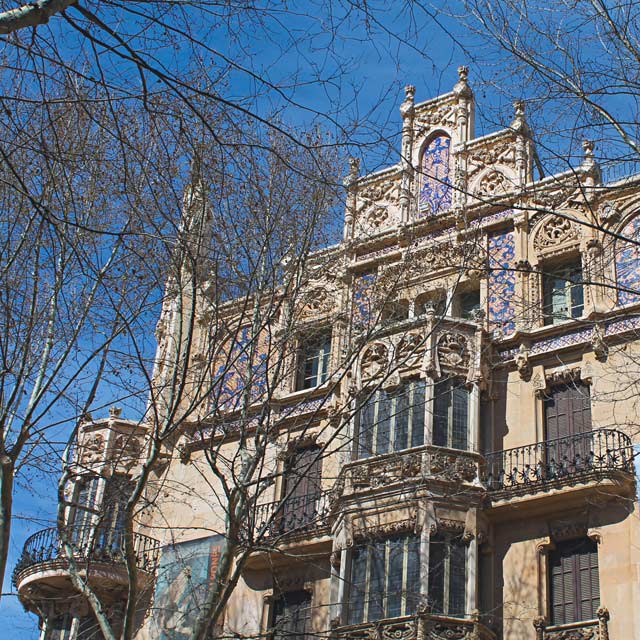 L’itinéraire commence face au bâtiment du Parlement des îles Baléares, l’ancien Cercle majorquin. La décoration moderniste est perceptible sur les fenêtres, colonnes et chapiteaux. À proximité se trouve également Can Corbella, un immeuble résidentiel original de style néo-mudéjar. Les colonnes en bois superposées sur la façade, associées aux arcs outrepassés et vitraux de couleur du rez-de-chaussée, sont quelques-uns de ses éléments les plus remarquables.